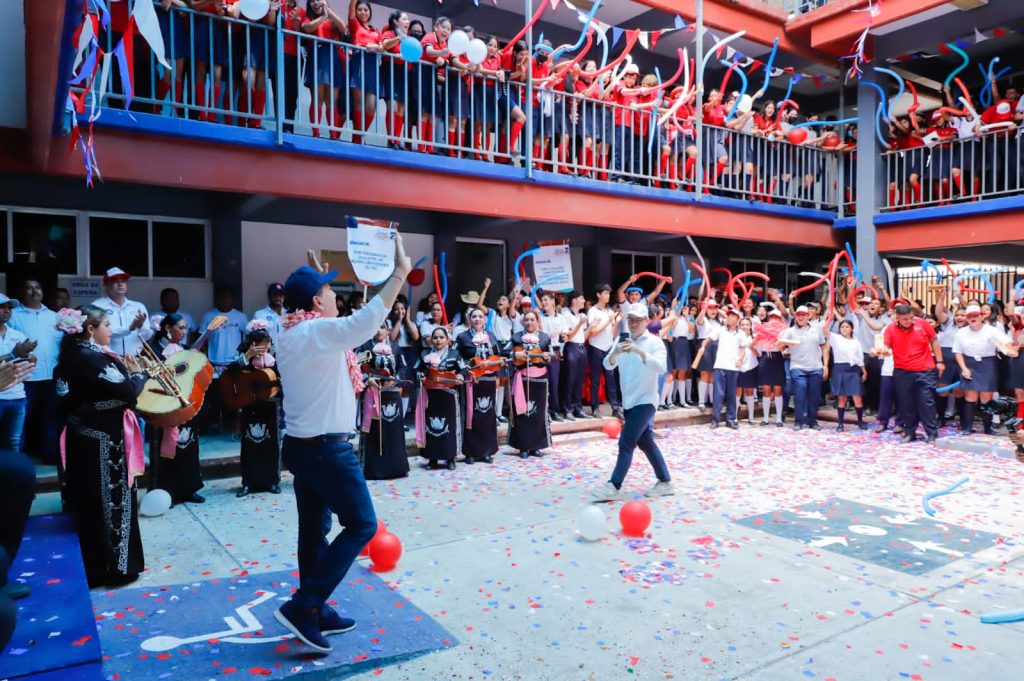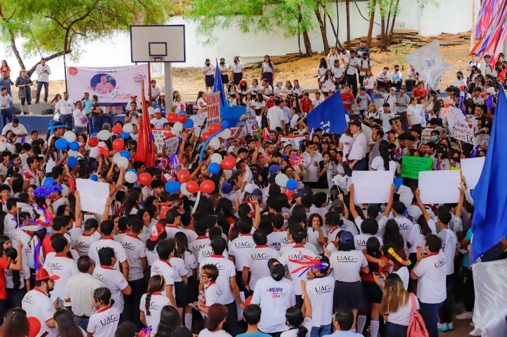 Los estudiantes recibieron al candidato de unidad con porras y pancartas, presentaron un número artístico y le cantaron música popular con alegría.