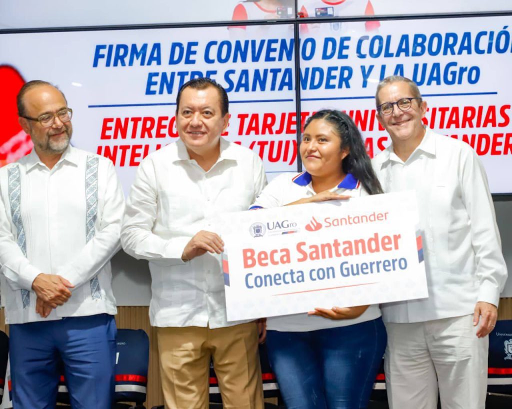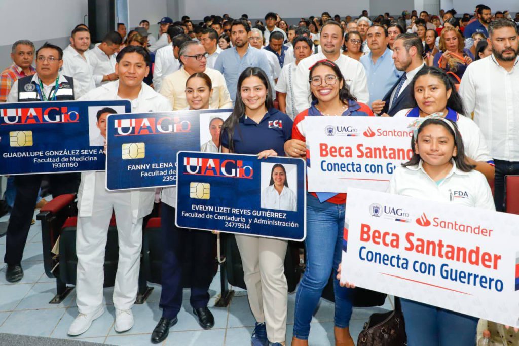 Durante el evento, realizado en el Auditorio de la Facultad de Medicina, la UAGro y Banco Santander México, otorgaron becas a estudiantes destacados y firmaron un convenio que permitirá a los beneficiarios, mediante su tarjeta, ingresar a la aplicación Campus Digital, con acceso a cursos gratuitos, becas adicionales y talleres de educación financiera.