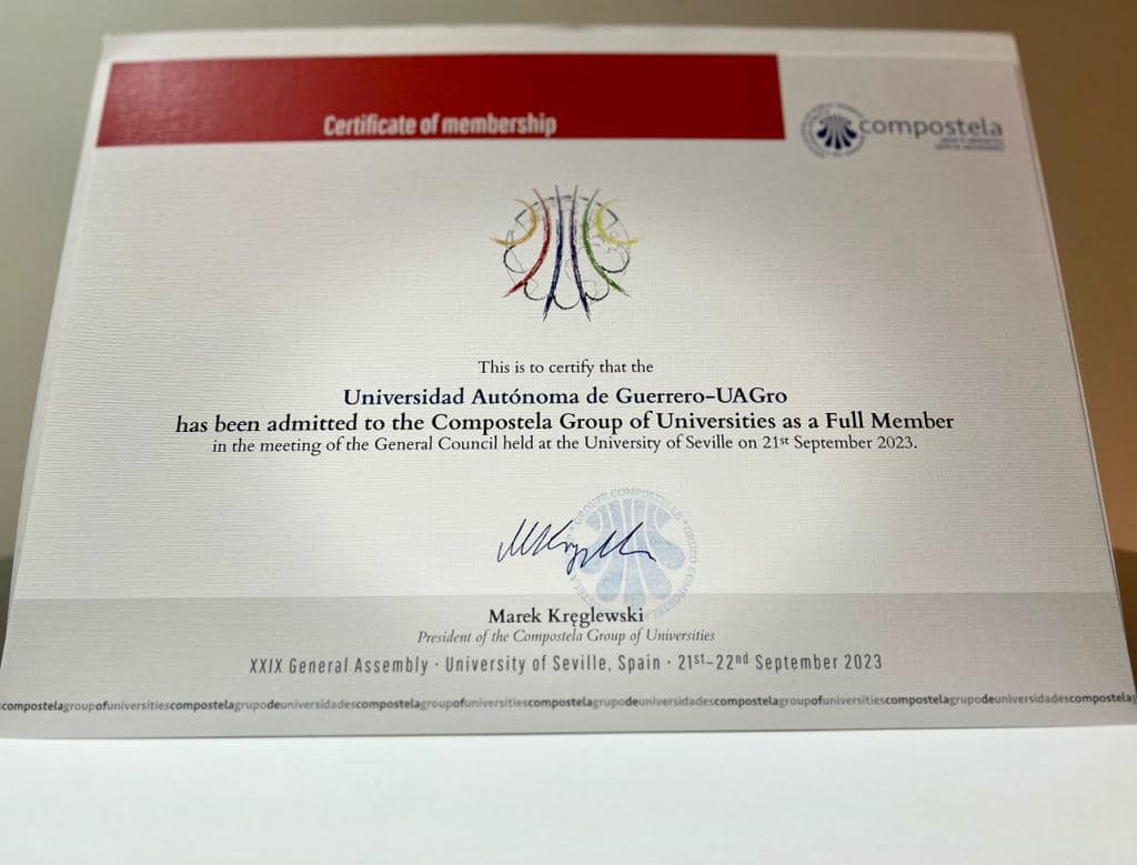 A partir de sus capacidades institucionales, calidad educativa, contribución al cumplimiento de los ODS y la agenda 2030, nuestra Universidad Autónoma de Guerrero fue aprobada como miembro permanente del Grupo Compostela de Universidades (CGU). Lo anterior, durante la XXIX Asamblea General del grupo celebrada en la Universidad de Sevilla, España, 21 y 22 de septiembre de 2023.