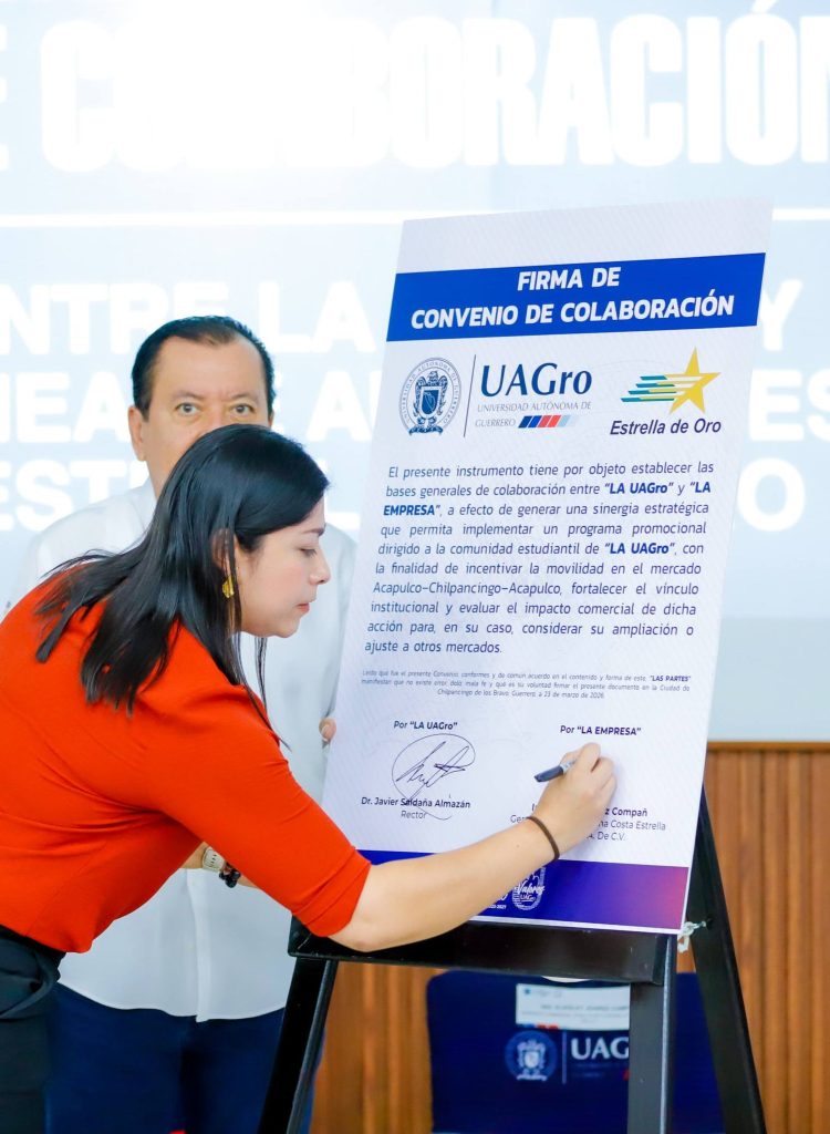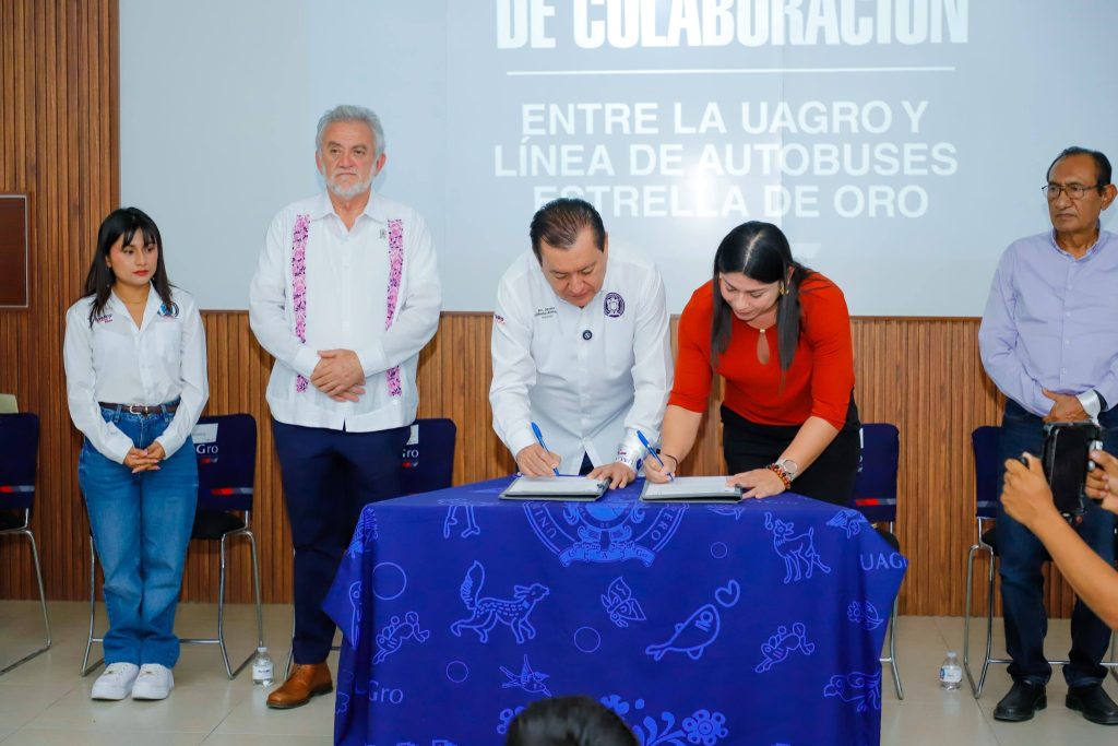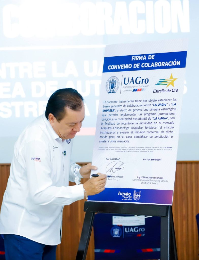 El rector de la Universidad Autónoma de Guerrero, Javier Saldaña Almazán firmó un convenio de colaboración con la empresa de transporte Estrella de Oro, que permitirá a estudiantes acceder a descuentos en boletos de autobús, así como a oportunidades de prácticas profesionales y servicio social.