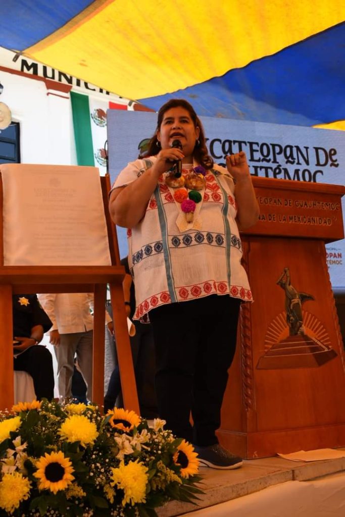 Ixcateopan, Gro., 26 de septiembre del 2023.- En representación de la gobernadora, Evelyn Salgado Pineda, la secretaria de Cultura, Aída Melina Martínez Rebolledo, asistió a la ceremonia por el 74 aniversario del Descubrimiento de los Restos del último Emperador Azteca, Cuauhtémoc.
