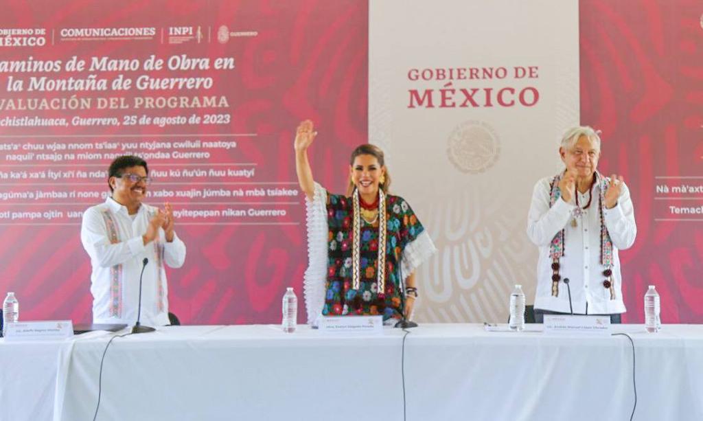 Cozoyoapan, Mpio. de Xochistlahuaca, Gro., 25 de agosto del 2023.- La gobernadora Evelyn Salgado Pineda acompañó al presidente de la República a la Evaluación del Programa Caminos de Mano de Obra en la Montaña de Guerrero, en donde se dio cuenta del avance que ha tenido el esquema que ocupa mano de obra local, el cual actualmente atiende a 23 municipios de la Costa Chica y Montaña, beneficiando a casi 517 mil habitantes.