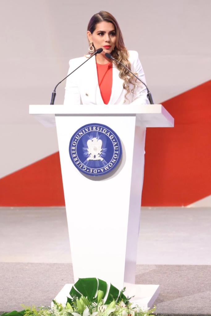 En su mensaje durante este evento celebrado en el Auditorio Estatal «Sentimientos de la Nación», Evelyn Salgado señaló que los jóvenes universitarios son los que impulsan la transformación, la educación, la ciencia, la innovación y la tecnológica, por lo que seguirá apoyando e impulsando a los jóvenes para que no haya fuga de talentos en Guerrero.