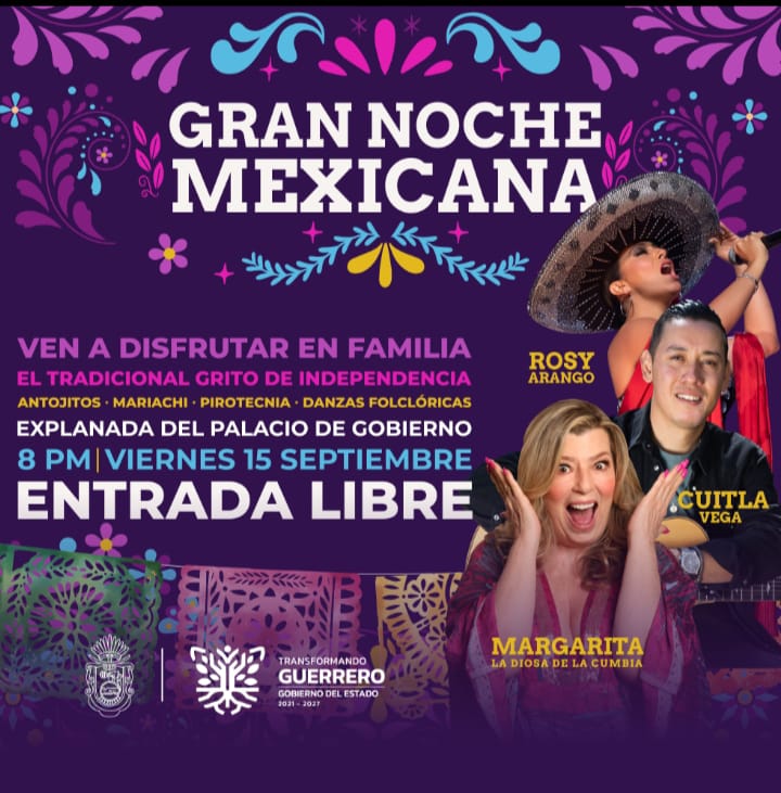Las voces de los guerrerenses se unirán para gritar juntos ¡Viva México! Y disfrutar en familia esta fecha con el mariachi, los antojitos mexicanos y un gran espectáculo de pirotecnia y conciertos con varios artistas alternando con Margarita «La diosa de la cumbia».