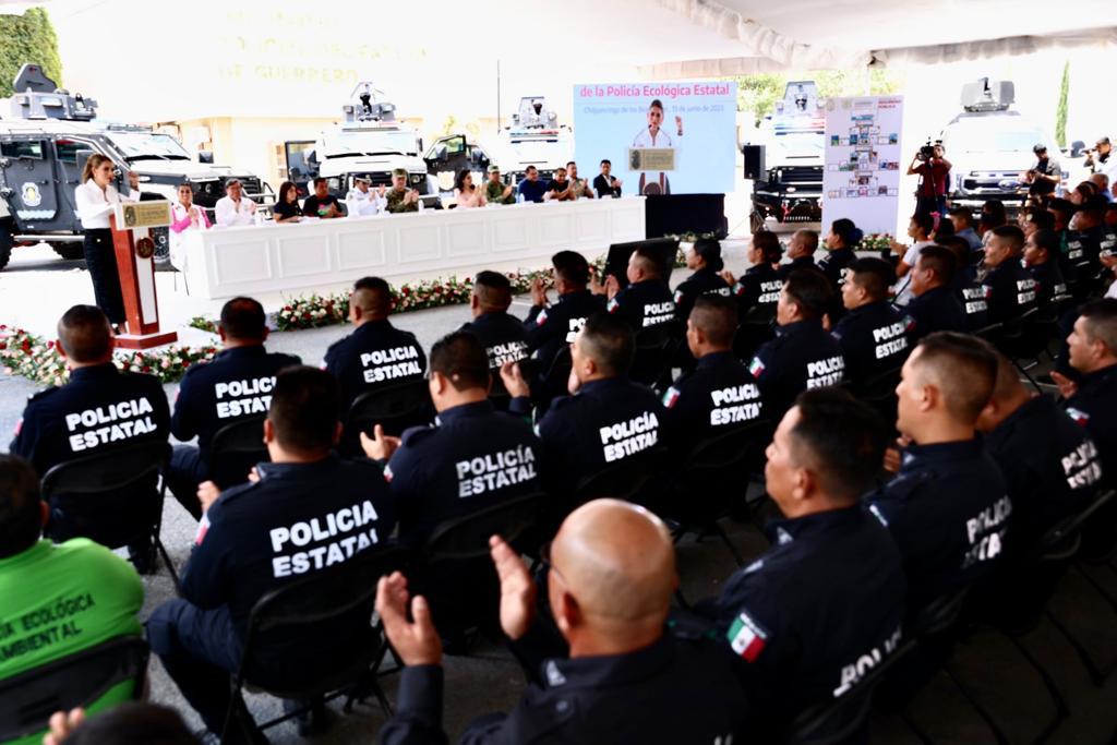 Chilpancingo, Gro. 13 de junio del 2023. – La gobernadora Evelyn Salgado Pineda puso en marcha la Unidad de la Policía Ecológica con el objetivo de coadyuvar en la protección de los recursos naturales y cuidado del medio ambiente en Guerrero e hizo entrega de ocho unidades tácticas de alto blindaje a la Policía del Estado con una inversión de casi 70 millones de pesos, para fortalecer las tareas operativas encaminadas mejorar la seguridad de los guerrerenses