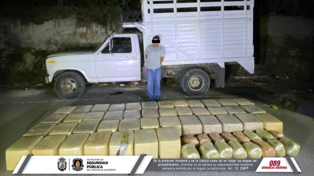 Chilpancingo, Guerrero, 03 de mayo de 2023.- En acciones de vigilancia y de prevención del delito, personal del Grupo de Operaciones Especiales Jaguar de la Policía Estatal aseguraron presunta droga y detuvieron a un individuo por su probable relación con este hecho, registrado sobre el tramo carretero Iguala-Chilpancingo, en la región Centro de la entidad.