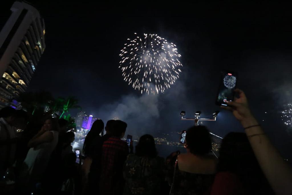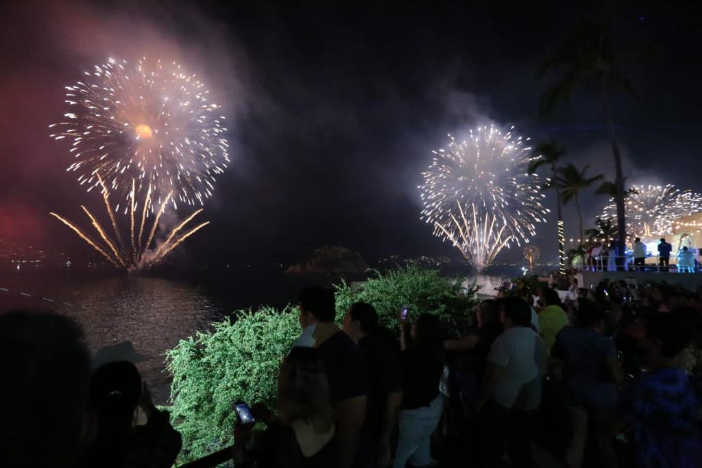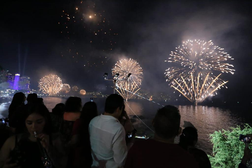 Con el conteo regresivo, más de 10 mil disparos de pirotecnia, 2 cañones de rayo láser y 200 drones, dieron la bienvenida al año 2023 e iluminaron el cielo de la Bahía de Acapulco que recobró su brillo y se posicionó en la preferencia de miles de visitantes nacionales y extranjeros que abarrotaron la franja de arena para presenciar el espectáculo de fin de año, el cual duró en total 18 minutos y requirió de un equipo de 40 personas especializadas en manejo de pirotecnia.