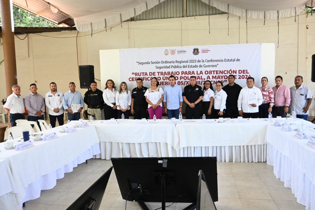 Tecpan de Galeana, Guerrero; a 12 de abril de 2023.- En representación del secretario de Seguridad Pública de Guerrero, Evelio Méndez Gómez, el director de la Policía Estatal, Gabriel Rebollar González presidió en el municipio de Tecpan de Galeana, la Segunda Sesión Ordinaria de la Conferencia de Seguridad Pública Estatal, donde se reunió con autoridades de la región de la Costa Grande con quienes abordó los lineamientos para la obtención del Certificado Único Policial y la generación de un diagnóstico intercultural.